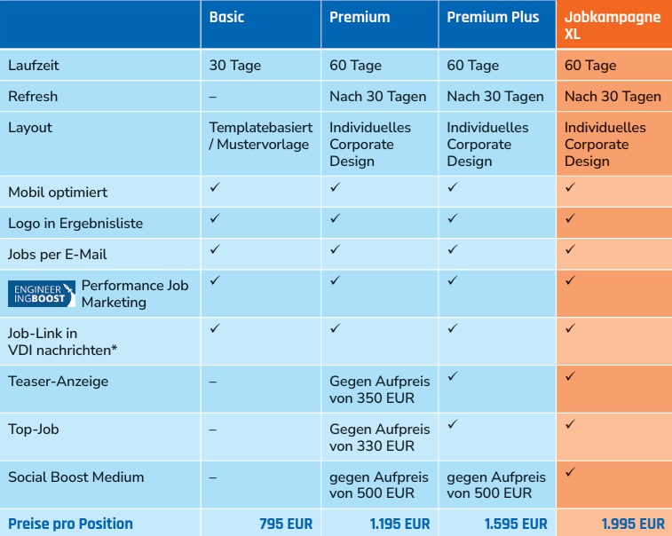 - Zusätzliches Erscheinen Ihrer Stellenanzeige in den VDI nachrichten mit 350.000 VDI nachrichten-Leser*innen
