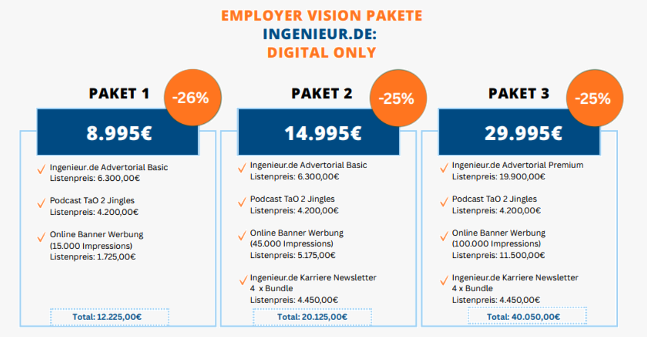 und zwar Omnichannel über alle Kanäle. Die Sichtbarkeit in passenden redaktionellen Umfeldern wie Energie, Verteidigung, Frauen im Ingenieurberuf oder Infrastruktur & Bautechnik ermöglicht Ihnen nicht nur hohe, sondern gezielte Reichweite in Ihrer Zielgruppe.