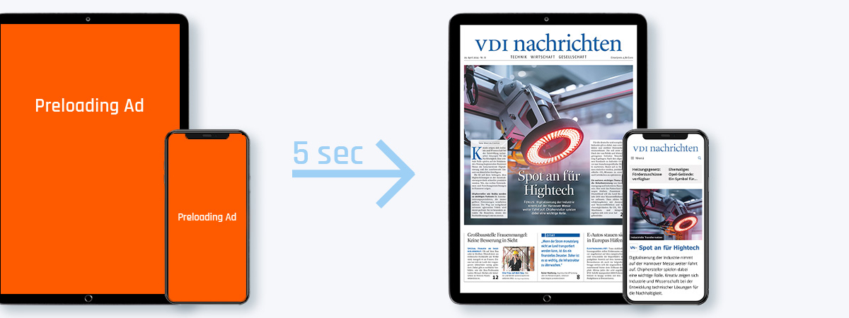 Manche lesen VDI nachrichten gern gedruckt. Andere bevorzugen die E-PaperApp. Erreichen Sie unsere App-Nutzer*innen mit Ihrer Werbebotschaft prominent und groß beim initialen App-Start. Oder innerhalb der E-Paper-Seiten von VDI nachrichten im thematisch passenden Umfeld. Nutzen Sie dafür PreLoading Ad und Fullscreen Ad für Tablet und Smartphone (iOS und Android).