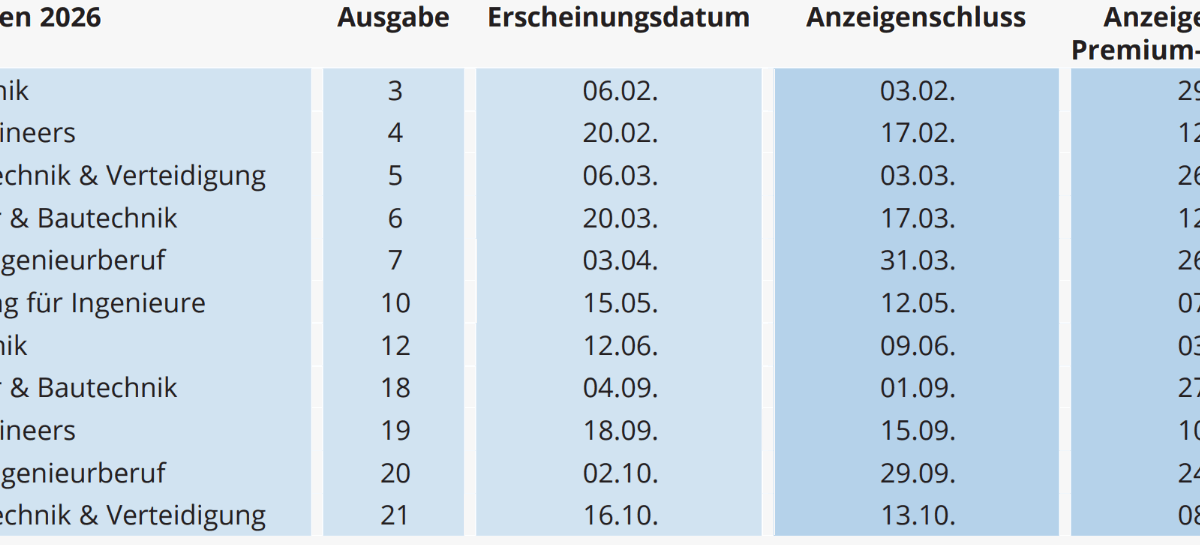 Die VDI-nachrichten-Redaktion setzt in „Karriere & Management“ mehrmals im Jahr Akzente zu aktuellen Karriere- und Managementthemen. Ihre Personalanzeige / Personalimageanzeige im direkten redaktionellen Umfeld bringt Sie in den Blick einer relevanten Zielgruppe – von Berufseinsteiger*innen bis zu erfahrenen Fach- und Führungskräften. So besetzen Sie Ingenieurvakanzen passgenau, wirtschaftlich und ohne Streuverluste.