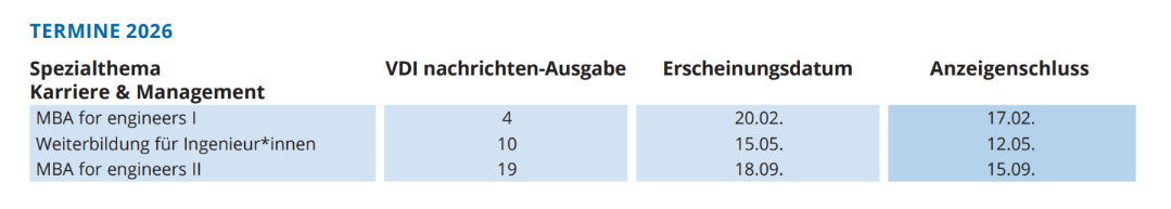 Sprechen Sie jetzt gezielt Ingenieurinnen und Ingenieure an, die interessiert an Weiterbildungsthemen sind – von Berufseinsteigenden bis zu technischen Fach- und Führungskräften. Die Spezialthemen in Karriere & Management der VDI nachrichten bieten Ihnen dafür das passende redaktionelle Umfeld. Sie eröffnen Einblicke in Weiterbildungsprogramme, die Ingenieurinnen und Ingenieure auf den aktuellen Stand von Technik und Management bringen, berichten aus der Praxis und geben wertvolle Tipps, wie man in Sachen Karriere weiterkommt. Bewerben Sie hier Ihr Weiterbildungsangebot mit einer Image- bzw. Seminaranzeige und stärken Sie nachhaltig Ihr Employer Branding.