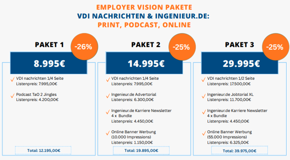 Mit sorgfältig recherchierten Artikeln und exklusiven Fokusthemen setzt sich die Marke VDI nachrichten sowohl in ihrer Print- als auch in ihrer Digitalversion thematisch stark vom Wettbewerb ab und steht für journalistische Exzellenz im Zeitalter der industriellen Transformation. VDI nachrichten bietet für erfolgreiches Emplorer Branding genauso wie für die gezielte Ansprache stellensuchender und wechselwilliger Ingenieur*innen vielfältige, attraktive Kommunikationsmöglichkeiten. Besonders hervorzuheben sind hier die Spezialthemen im Zeitungsteil Karriere & Management.