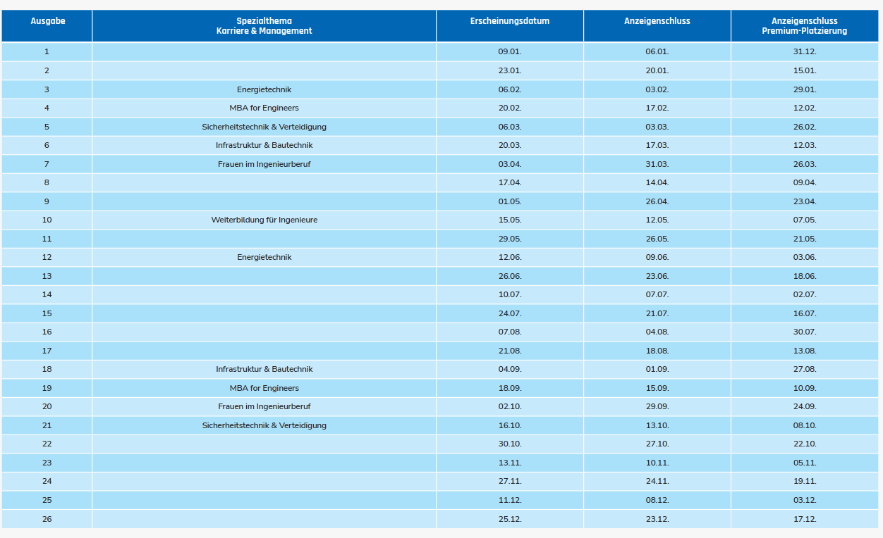 Die VDI-nachrichten-Redaktion setzt in „Karriere & Management“ mehrmals im Jahr Akzente zu aktuellen Karriere- und Managementthemen. Ihre Personalanzeige / Personalimageanzeige im direkten redaktionellen Umfeld bringt Sie in den Blick einer relevanten Zielgruppe – von Berufseinsteiger*innen bis zu erfahrenen Fach- und Führungskräften. So besetzen Sie Ingenieurvakanzen passgenau, wirtschaftlich und ohne Streuverluste.